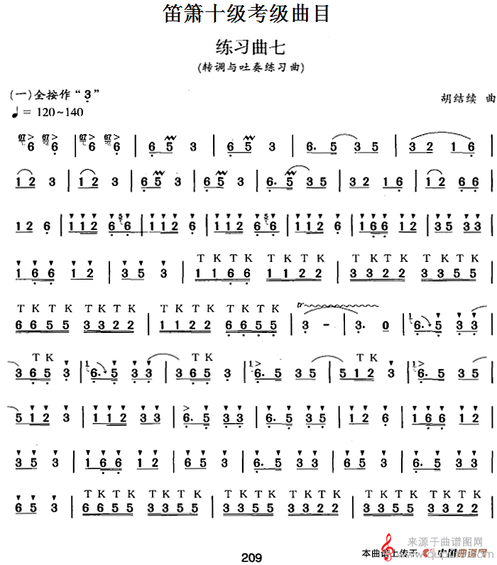 曲谱图网为您提供笛箫十级考级曲目:练习曲七(转调与吐奏练习曲)(笛箫)找谱子,就上曲谱图网。