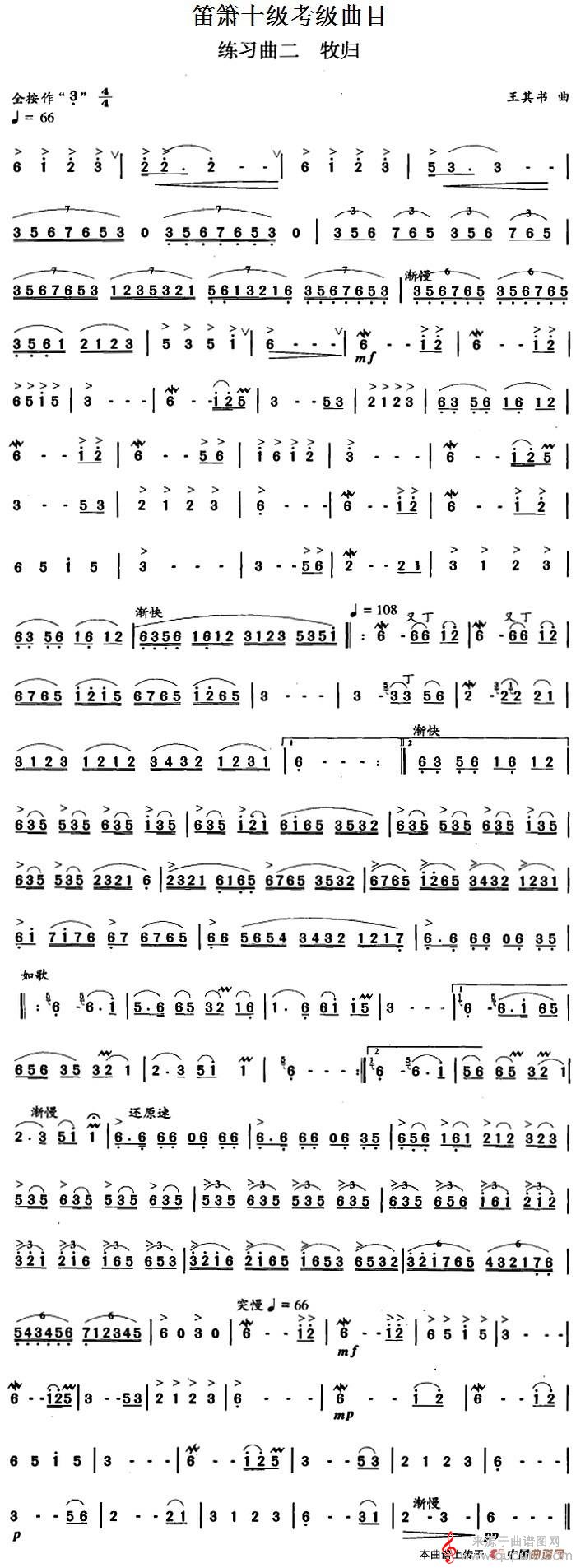曲谱图网为您提供笛箫十级考级曲目:练习曲二(牧归)(笛子曲谱)找谱子,就上曲谱图网。