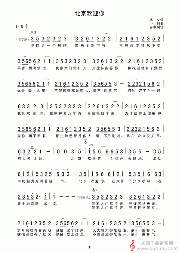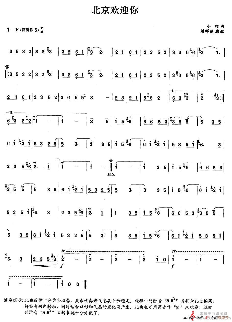 曲谱图网为您提供北京欢迎你歌曲曲谱(北京欢迎你竹笛演奏简谱)找谱子,就上曲谱图网。