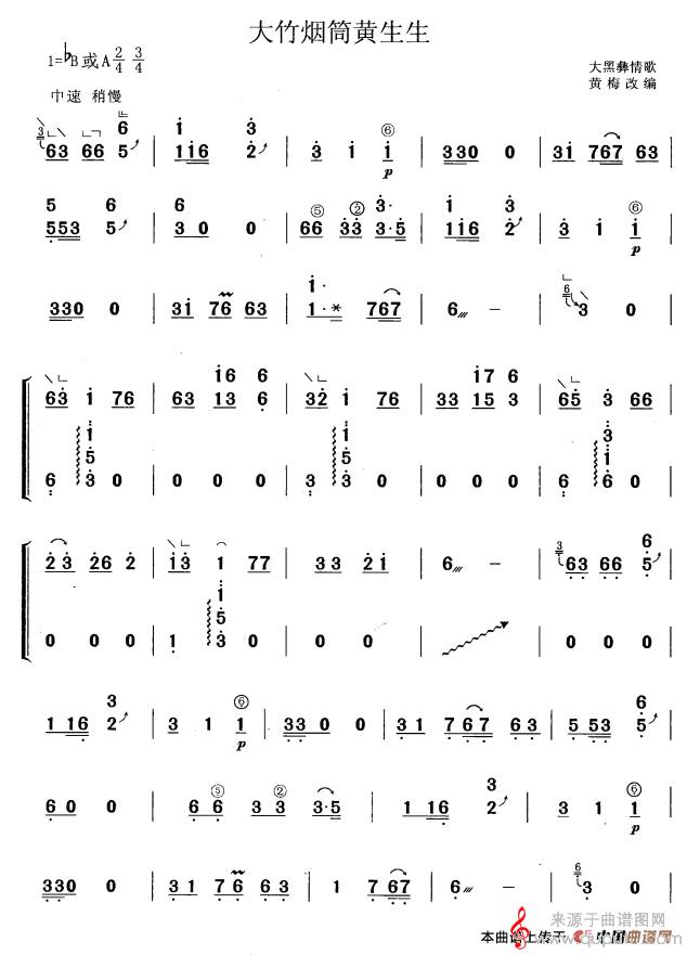 大竹烟筒黄生生(黄梅改编版大黑彝民歌大竹烟筒黄生生简谱教学)