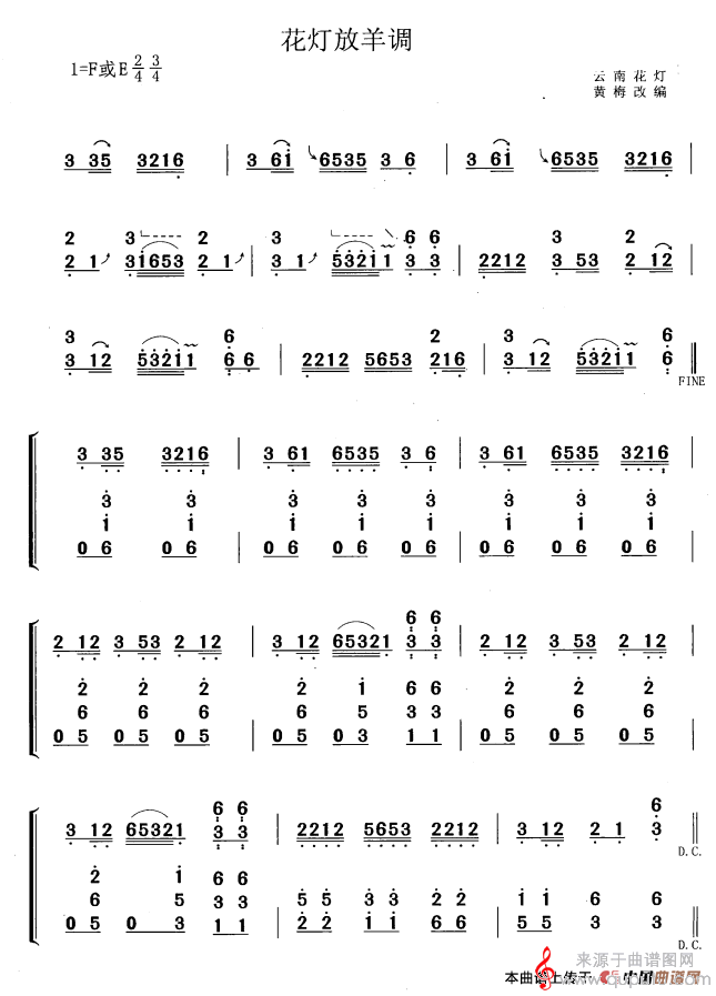 曲谱图网为您提供花灯放羊调(黄梅改编版云南花灯花灯放羊调简谱曲谱)找谱子,就上曲谱图网。