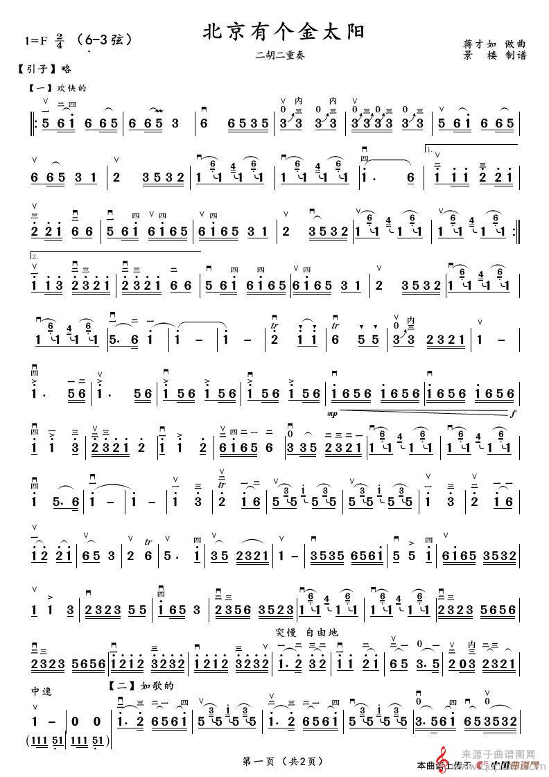 曲谱图网为您提供北京有个金太阳(北京有个金太阳二胡二重奏蒋才如版)找谱子,就上曲谱图网。