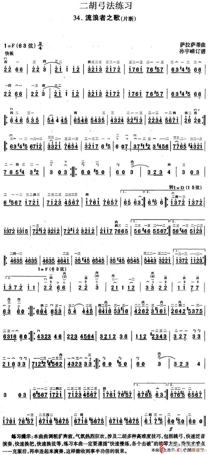 二胡弓法练习:流浪者之歌(片段)简谱(二胡弓法练习:流浪者之歌(片段)示范曲)