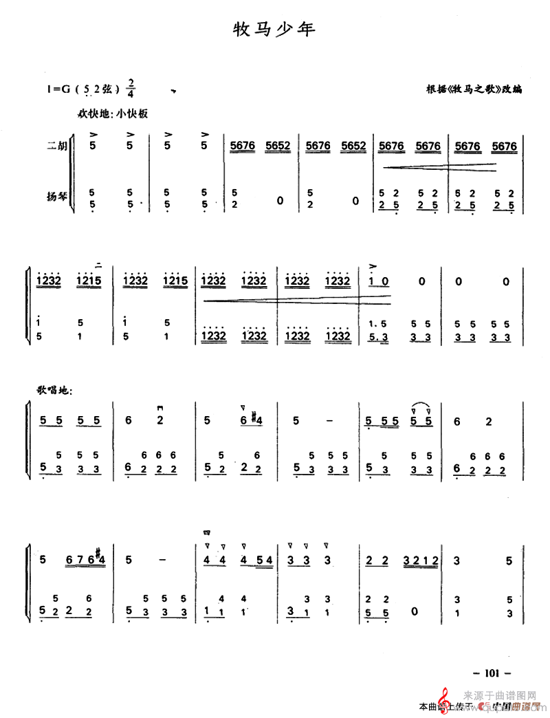 牧马少年简谱(牧马少年二胡+扬琴合奏曲谱)