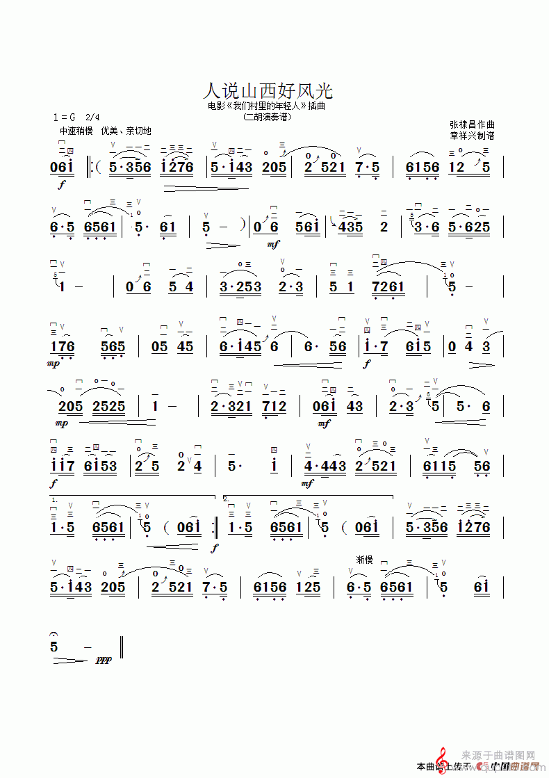 曲谱图网为您提供人说山西好风光简谱(人说山西好风光二胡演奏曲谱、章祥兴制谱版)找谱子,就上曲谱图网。