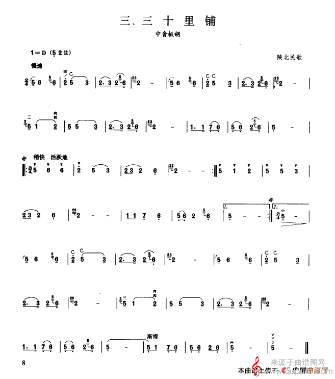 曲谱图网为您提供三十里铺民歌简谱(三十里铺 板胡曲集第二级 中音板胡演奏曲谱)找谱子,就上曲谱图网。