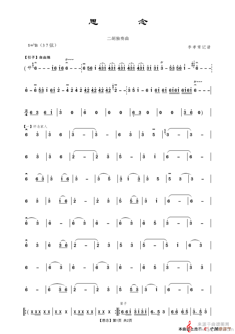 曲谱图网为您提供思念简谱(思念二胡独奏歌曲版)找谱子,就上曲谱图网。
