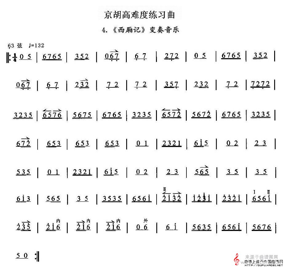 曲谱图网为您提供京胡高难度练习曲4、《西厢记》变奏音乐简谱曲谱找谱子,就上曲谱图网。