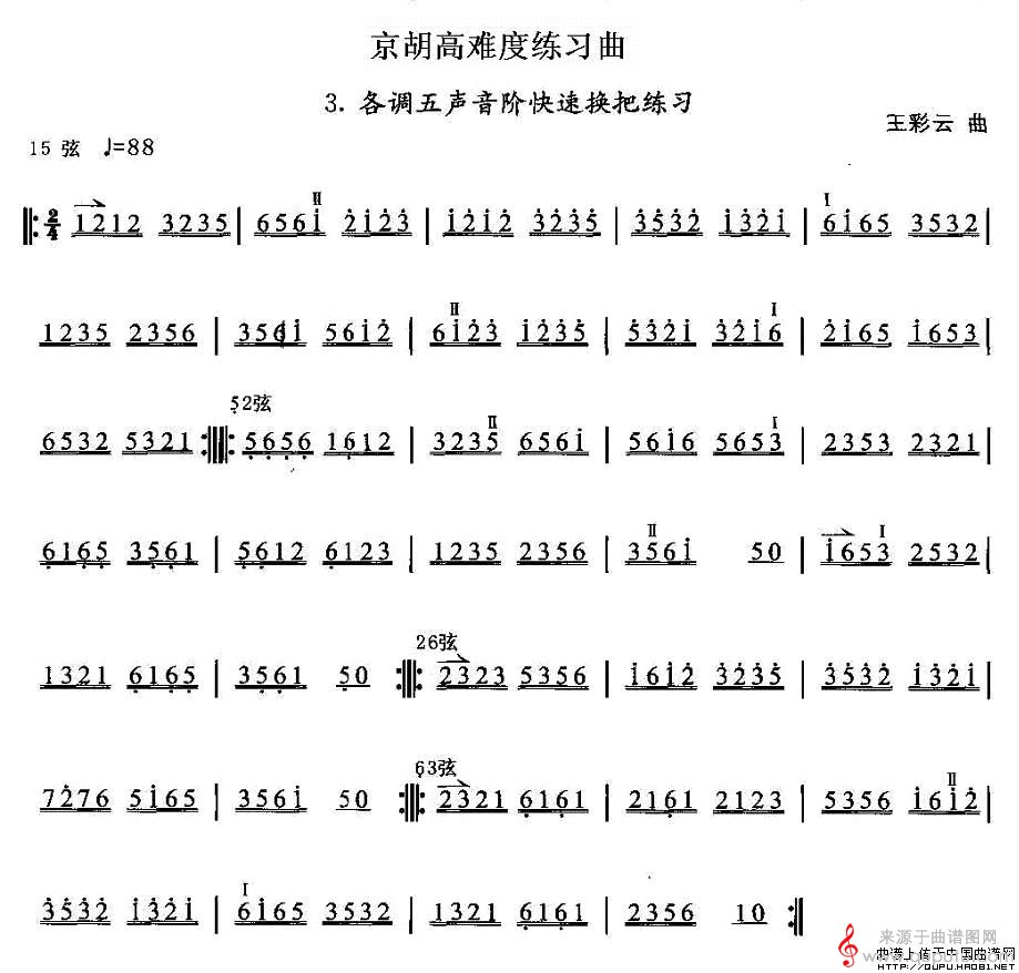曲谱图网为您提供京胡高难度练习曲3、各调五声音阶快速换把练习(简谱曲谱)找谱子,就上曲谱图网。