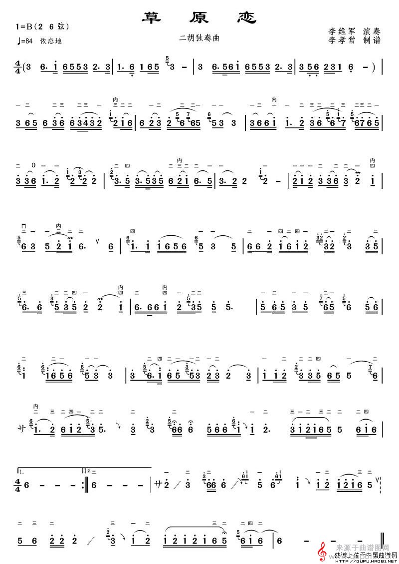 曲谱图网为您提供草原恋(二胡独奏曲草原恋简谱)找谱子,就上曲谱图网。