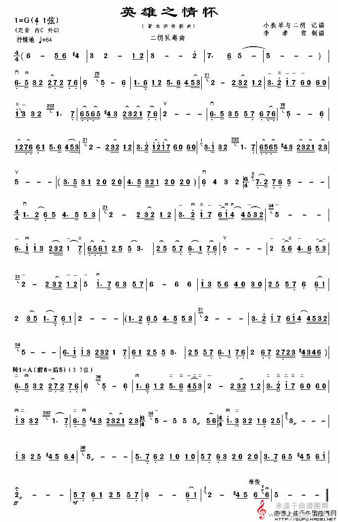 英雄之情怀二胡独奏曲(新水浒传插曲英雄之情怀简谱曲谱)