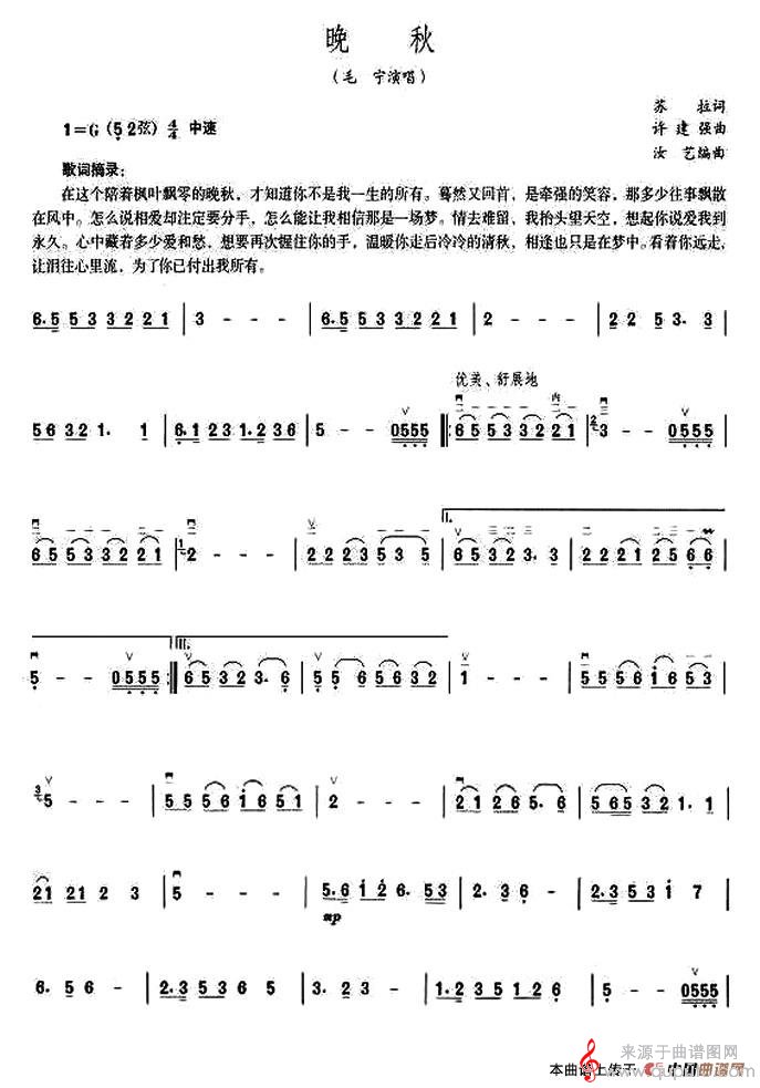 曲谱图网为您提供晚秋(晚秋简谱胡琴谱教学)找谱子,就上曲谱图网。