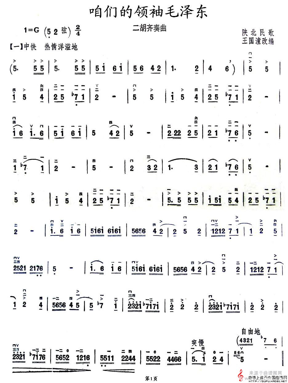 曲谱图网为您提供咱们的领袖毛泽东(陕北民歌咱们的领袖毛泽东二胡齐奏歌词简谱)找谱子,就上曲谱图网。