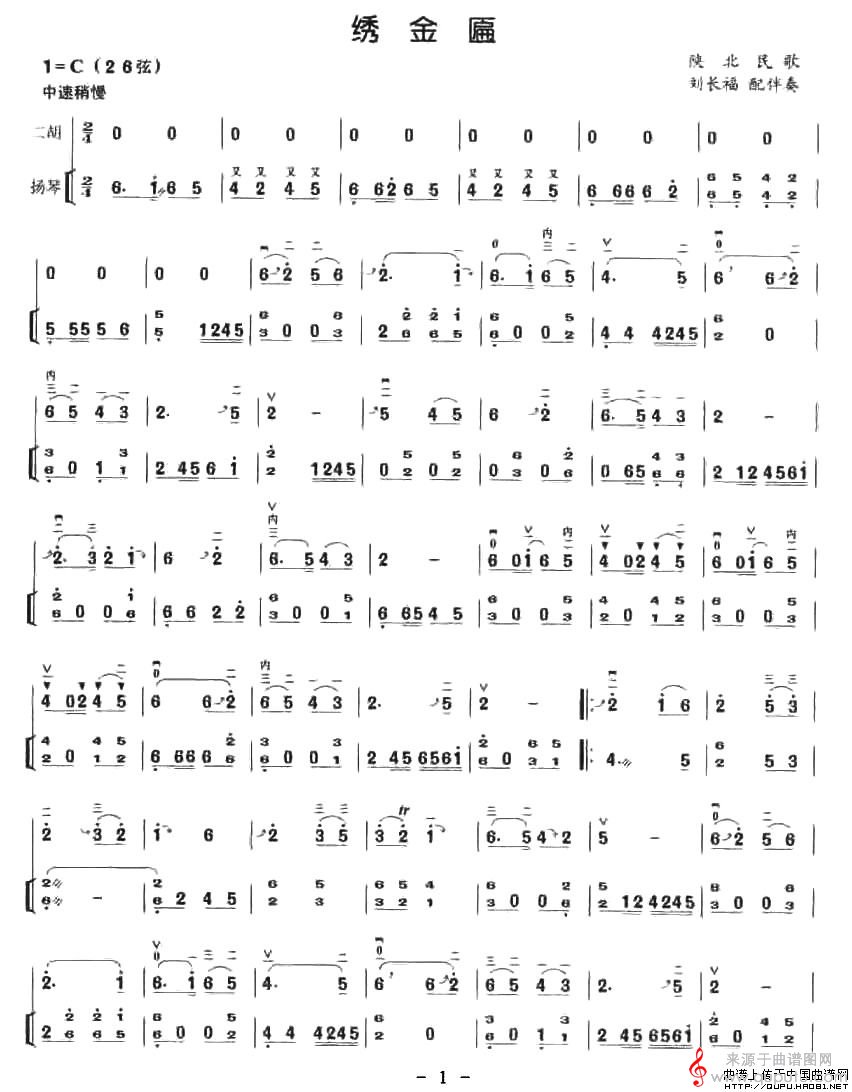 曲谱图网为您提供绣金匾(陕北民歌绣金匾扬琴伴奏谱简谱曲谱)找谱子,就上曲谱图网。