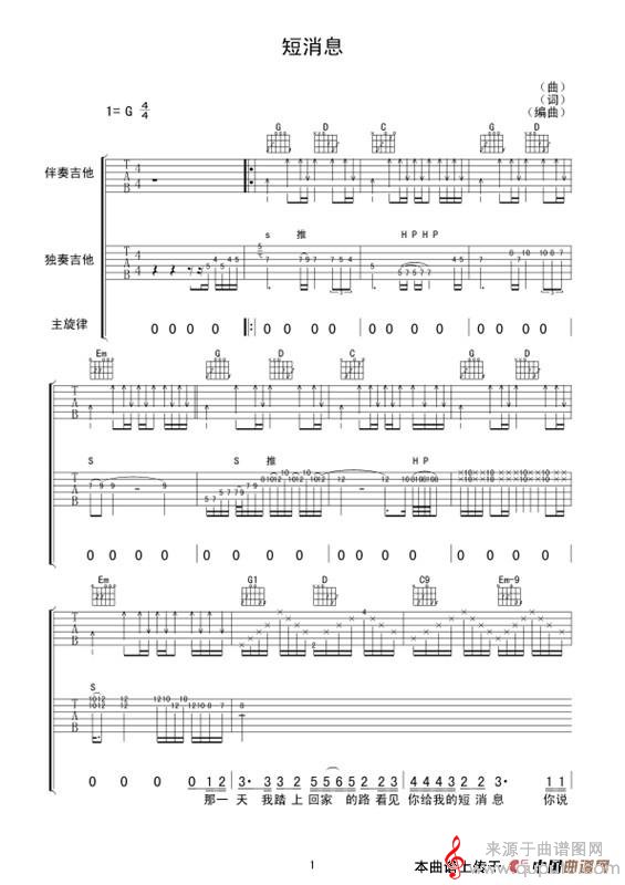 曲谱图网为您提供短消息(张家源 词曲)找谱子,就上曲谱图网。