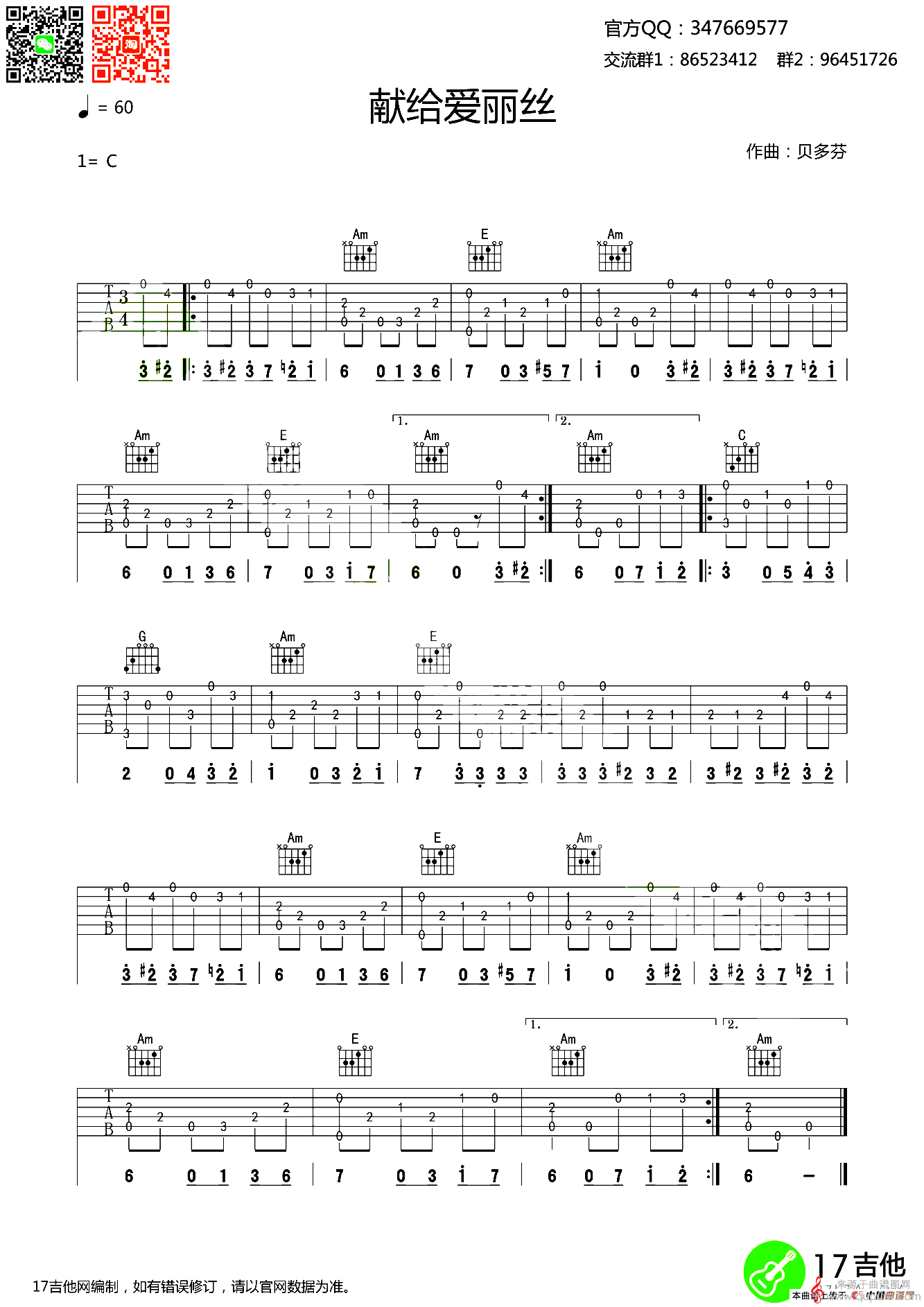 当前位置:曲谱图网器乐曲谱吉他献给爱丽丝(指弹谱)