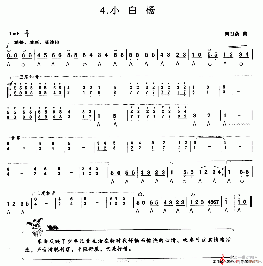 曲谱图网为您提供小白杨(口琴曲独奏简谱)找谱子,就上曲谱图网。