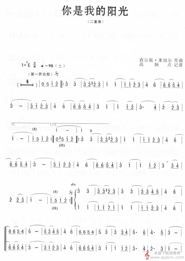 曲谱图网为您提供你是我的阳光(你是我的阳光萨克斯二重奏独奏演奏简谱五线谱)找谱子,就上曲谱图网。