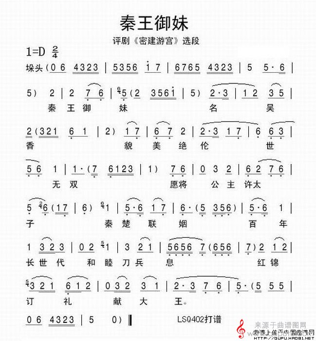 曲谱图网为您提供秦王御妹(《密建游宫》选段)找谱子,就上曲谱图网。