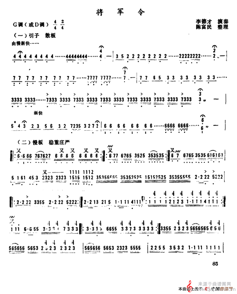 曲谱图网为您提供将军令(李德才演奏陈富民整理版简谱)找谱子,就上曲谱图网。