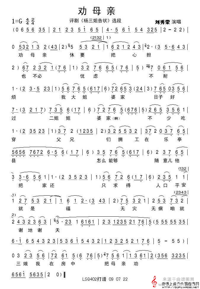曲谱图网为您提供劝母亲(《杨三姐告状》选段)找谱子,就上曲谱图网。