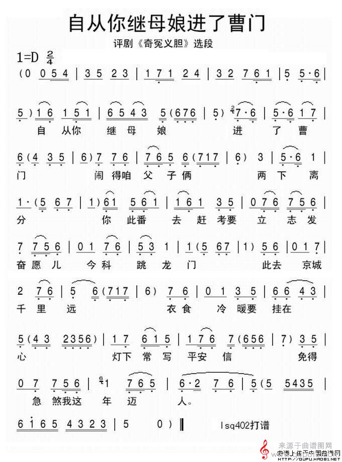 曲谱图网为您提供自从你继母娘进了曹门(《奇冤义胆》选段)找谱子,就上曲谱图网。